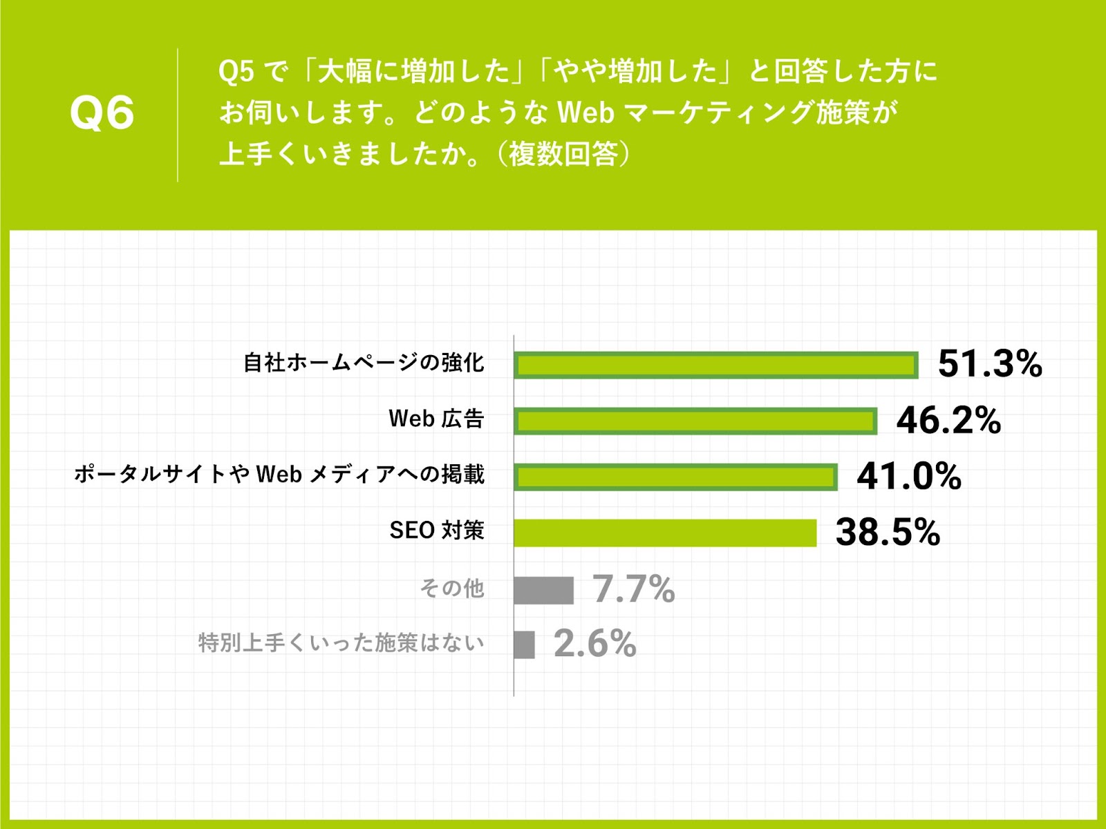 「自社ホームページの強化」が51.3%、「Web広告」が46.2%、「ポータルサイトやWebメディアへの掲載」が41.0%という回答となりました。