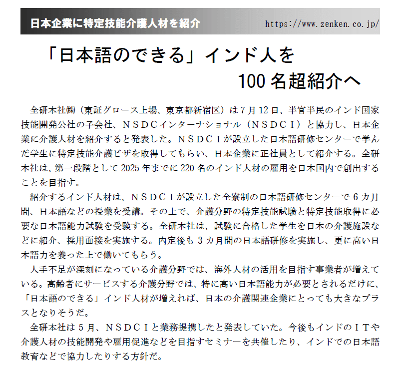 2023.07.24 Media 【メディア掲載】東経情報に掲載されました 東経情報にてNSDC Internationalとの協力協定に関する記事が掲載されましたのでお知らせいたします。 東経情報2023.07/24号 「日本語のできる」インド人を100 名超紹介へ NEWS TOP 前の記事へ 次の記事へ NEWS TOP