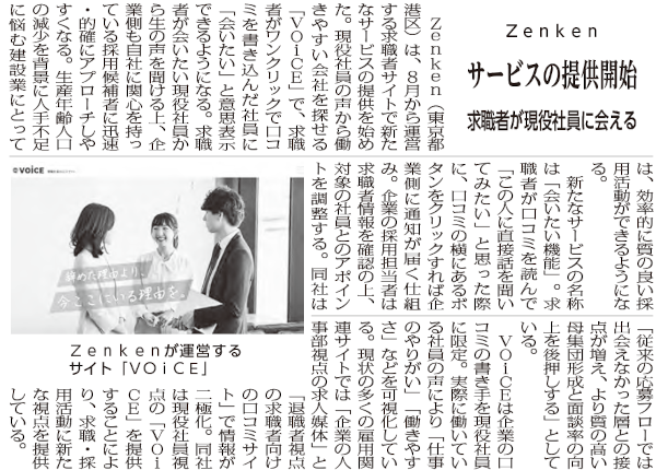 建通新聞にて、当社が運営するVOiCEに関する記事が掲載されましたのでお知らせいたします。