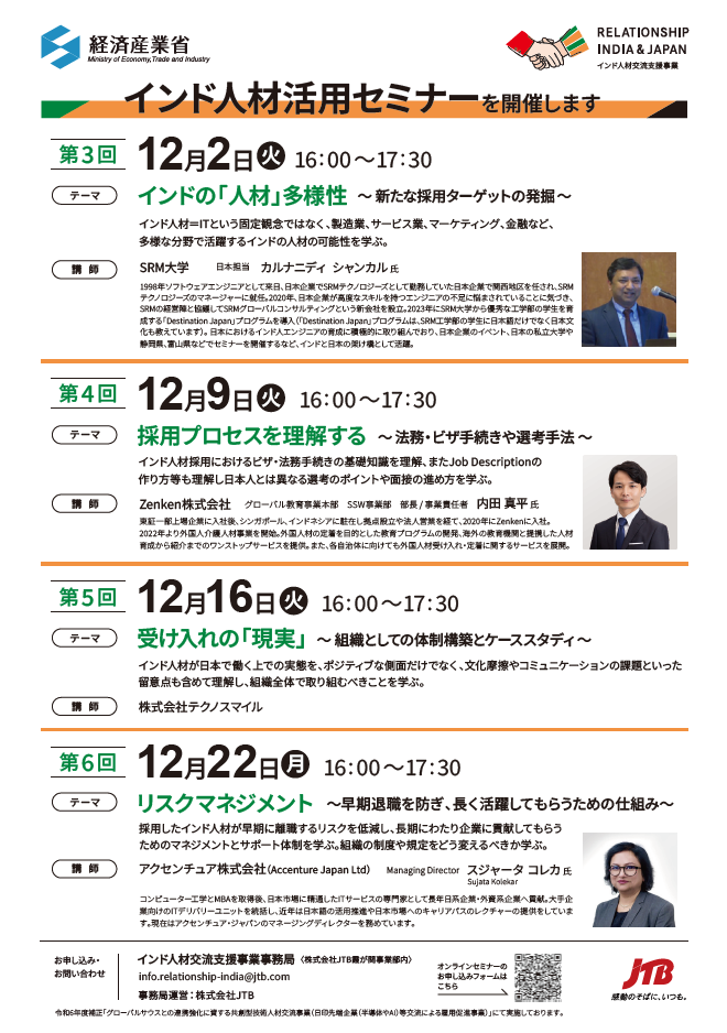 | セミナー名 | インド人材活用オンラインセミナー 第4回 「採用プロセスを理解する ~ 法務・ビザ手続きや選考手法 ~」 |